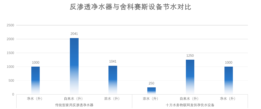 家用反渗透净水器的平均水效为 49%,每生产 1000 升(约等于 1 吨)净化水,依然会消耗或浪费(直排式)1041 升淡水资源。作为净饮水大设备节水技术的开创者,舍科赛斯™物联网直供净饮水设备以多年的实践经验证明:舍科赛斯™直供净饮水不仅是安全健康饮水,更是在环保节能、节约用水等方面完全超越传统型家用反渗透净水器。时间是最好的见证, 随着人们消费水平的不断提升,对环保健康净饮水的关注和需求也日益提高,物联网直供净饮水设备势必成为净水行业主流。事实上消费市场和终端用户已经做出了正确的选择。