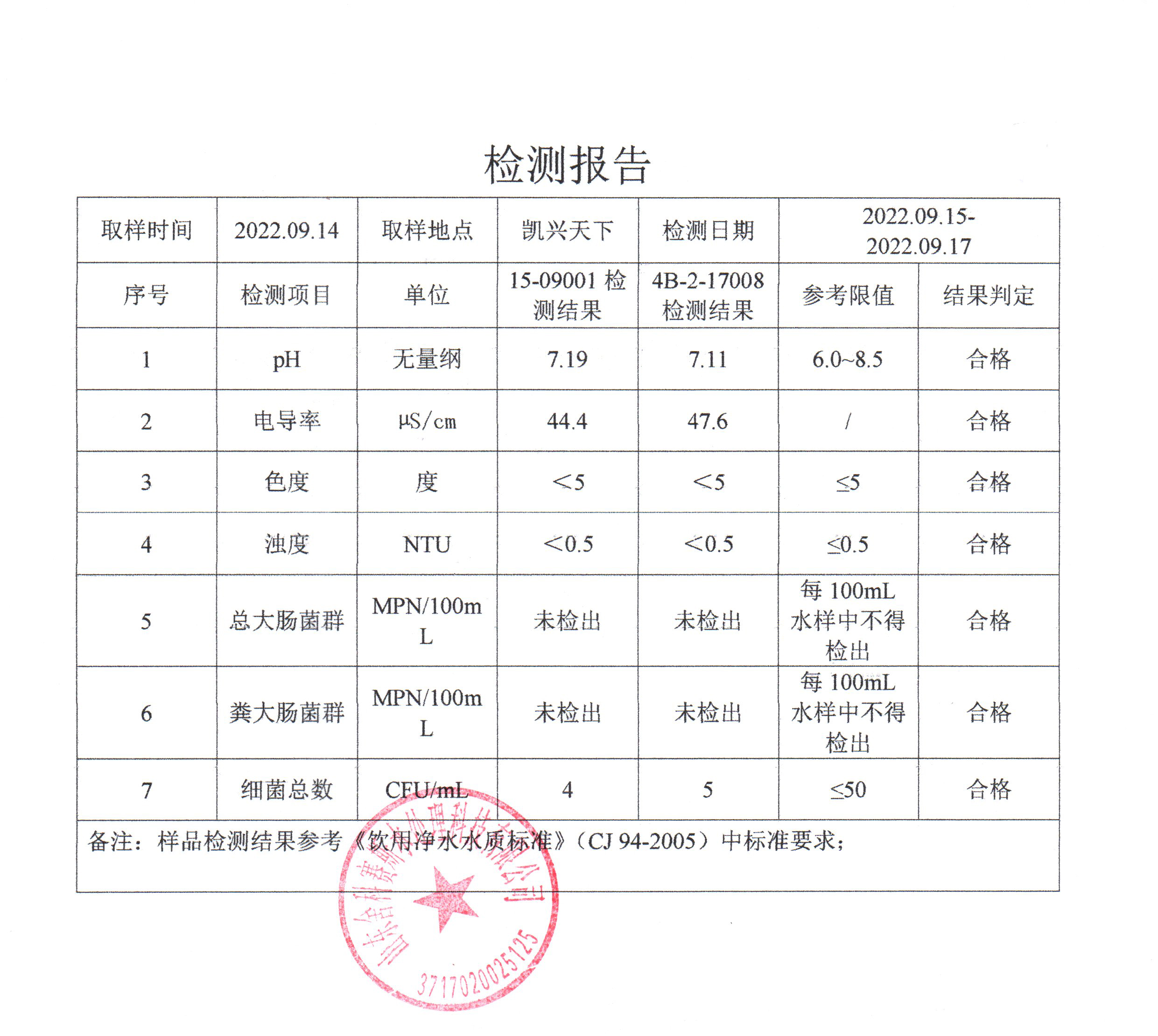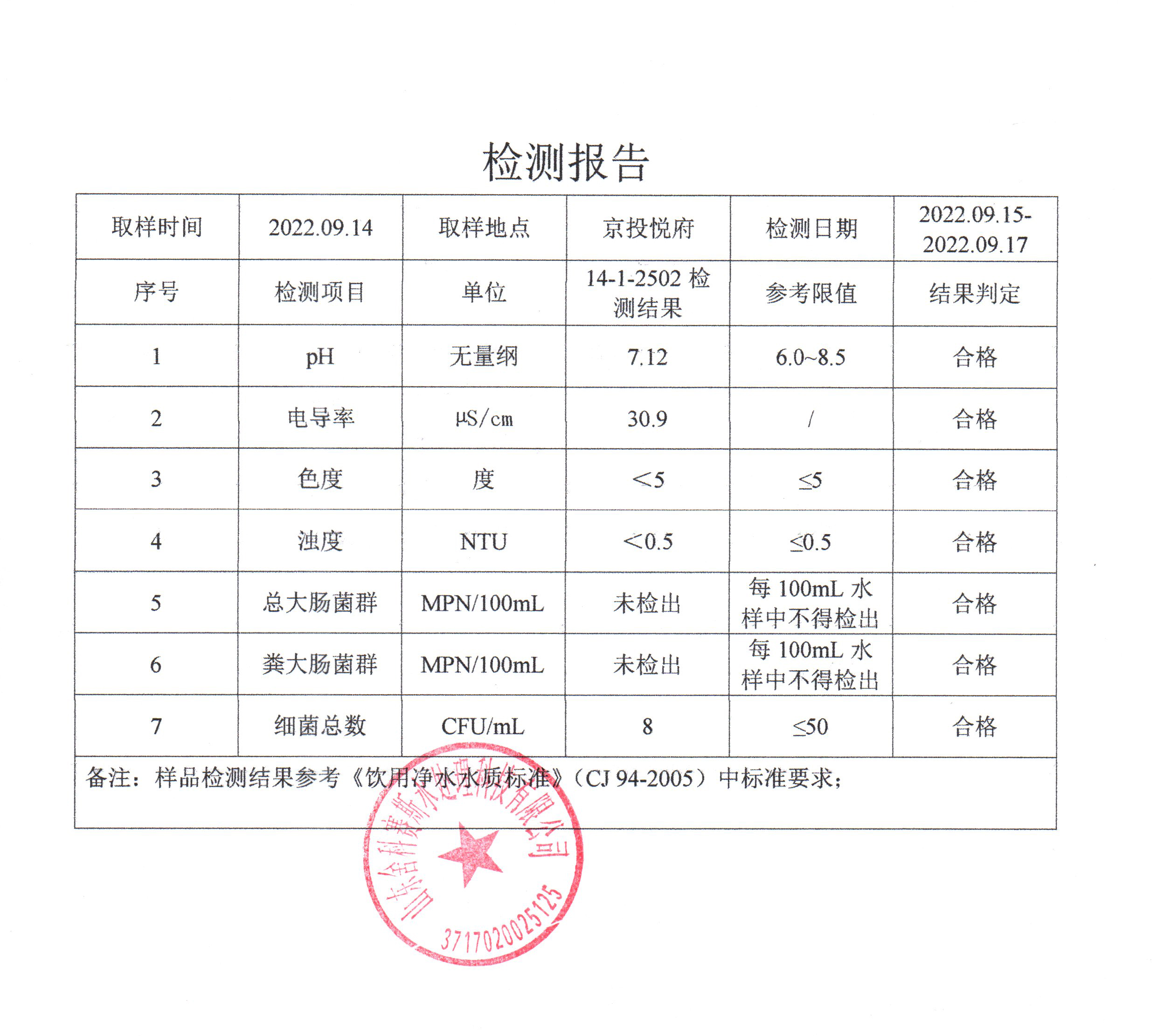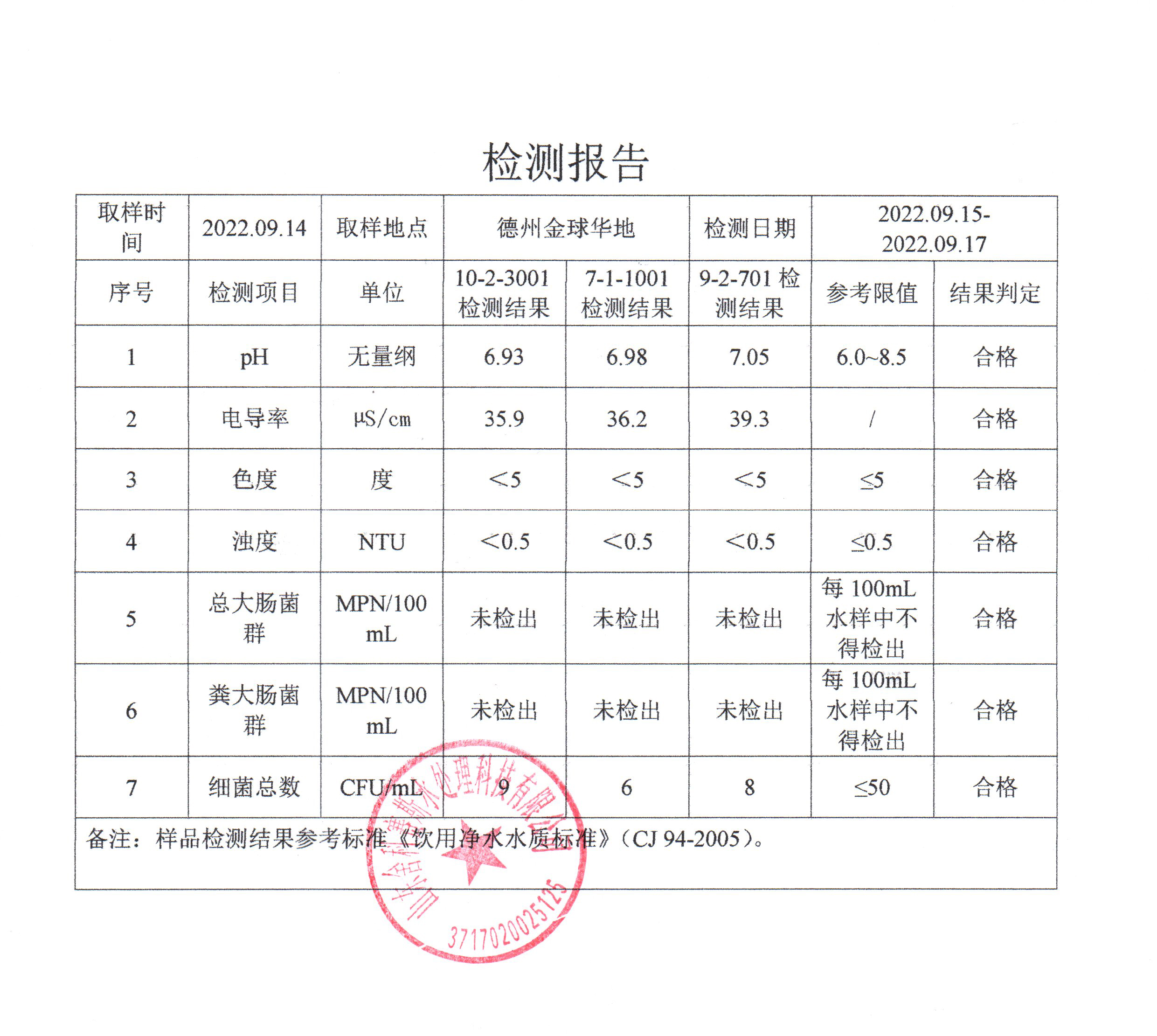 从检测报告看,每个社区抽检的管道直饮水水样各项检测指标都符合《饮用净水水质标准》CJ94-2005。也由此可见,十方水务对管道直饮水水质的高度重视,严格执行国家相关标准,加强直饮水的抽检频率,在每月自检的基础上,还每年委托有检测资质的第三方检测机构对管道直饮水供水小区进行抽检,保障老百姓喝上更安心、更放心的优质水。